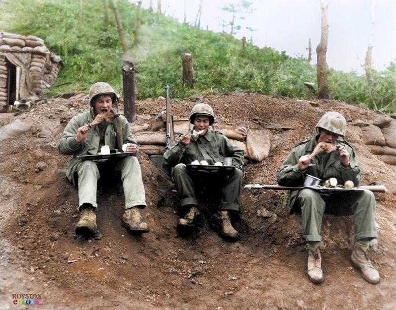 美军士兵在战斗间隙大快朵颐。