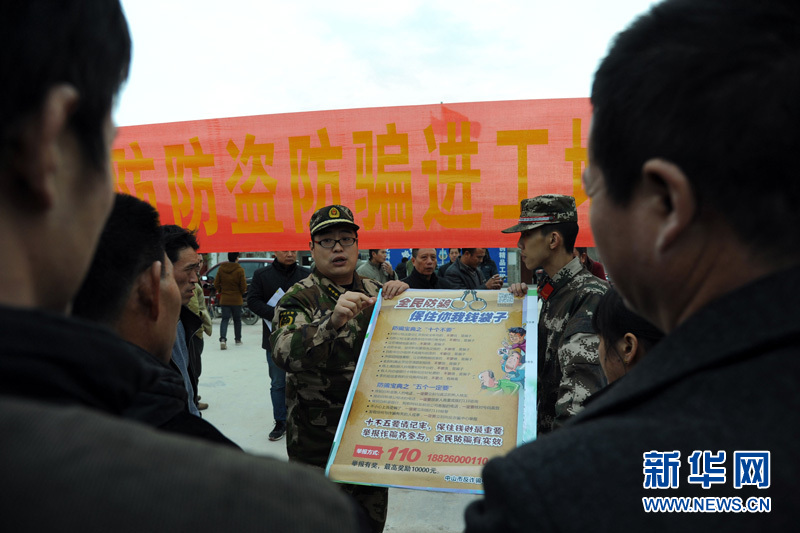 26日,广东中山边防支队沙头涌边防派出所开展防骗防盗宣传进工地活动,将普法宣传扑克牌送到外来务工人员手中。