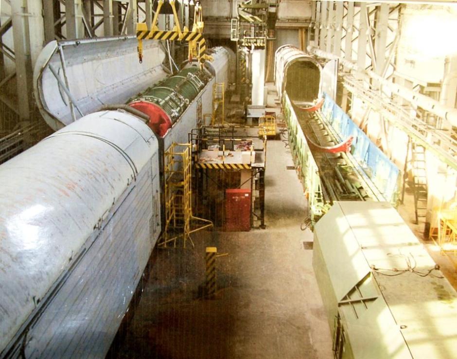 苏联/俄罗斯SS-24“手术刀”导弹列车在类似建筑中维护检修的画面。