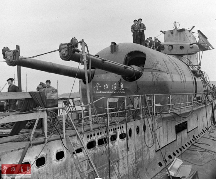 由于搭载有一座双联203毫米主炮,”絮库夫“号又被称为”水下巡洋舰“。该主炮最大射程24千米,但射速较低,仅为每分3发。因其巨大炮塔外露,严重影响了潜艇的隐蔽性,而且射击准备时间太长,上浮后转入炮击状态的时间为2分半钟,实际实用性十分有限。图中由于炮管在下潜时无法收回,所以在炮口加装了防水塞,在使用时可通过电钮电动开启。