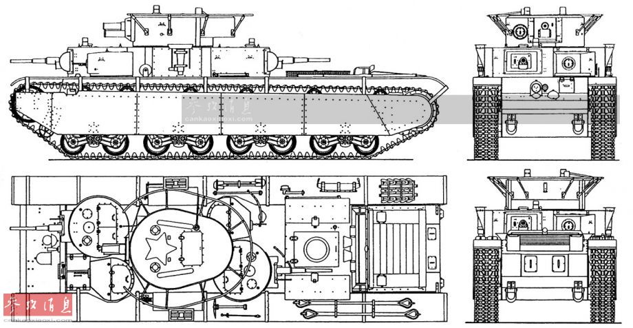 苏联陆军于1935年装备的T-35重型坦克是第一种大规模量产的多炮塔坦克,共制造了61辆。T-35全重45吨,车身上共搭载有5座炮塔,包括1门76毫米主炮、2门45毫米副炮、其余2座炮塔主要搭载7.62毫米机枪(全车共搭载有6挺机枪)。多视图可见除主炮塔外,其余4座小炮塔采用“簇拥”方式布置在主炮塔四周,基本达到360度全射界覆盖。
