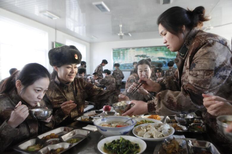2016年1月16日,黑龙江省黑河市,六名女兵与大家一起在食堂进餐。