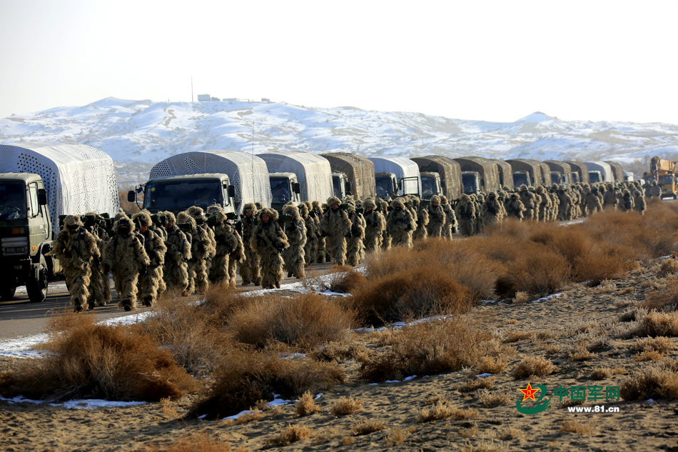 2016年1月,海军陆战队赴新疆沙漠戈壁寒训,这是海军陆战队某旅进行400公里跨昼夜综合战术演习