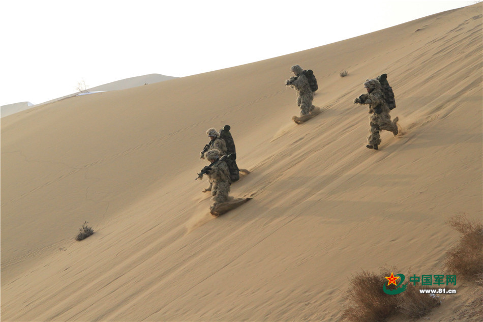 2016年1月,海军陆战队赴新疆沙漠戈壁寒训,这是海军陆战队员依托沙漠地形进行班组战术训练。