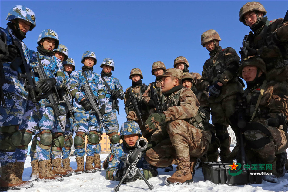 2016年1月,海军陆战队赴新疆沙漠戈壁寒训,这是参训队员对某型高精度榴弹发射器进行深入交流。