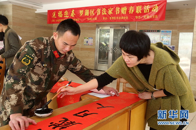 30日,广东深圳罗湖区10名书法家走进广东边防总队六支队,开展“迎新春送春联”活动,为这个支队官兵及官兵家属送来祝福。