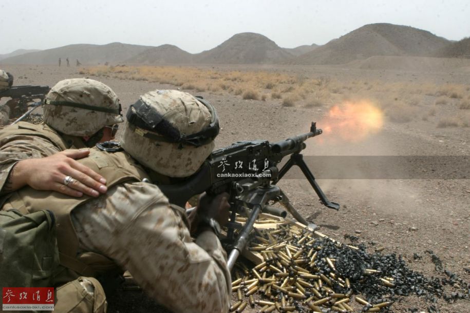 美军陆战队机枪手使用M240通用机枪猛烈开火,周围弹壳遍地。