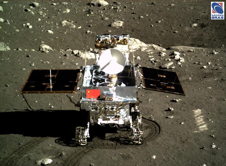 这些图像是“嫦娥3号”项目执行期间由“嫦娥-3号”着陆器以及“玉兔”号月球车在月球表面拍摄的。 图为“嫦娥-3号”着陆器,照片由玉兔号月球车全景相机拍摄。图像来源:中国科学院国家天文台月球与深空探测研究部官网