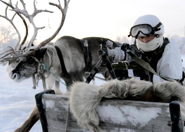 俄军在北极训练使用鹿拉雪橇