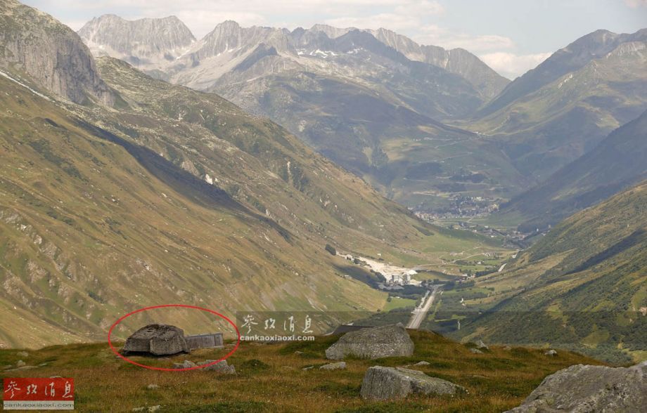 这张照片摄于2015年8月6日,在扼守瑞士Urserental山谷入口的高地上,隐蔽着一处火炮要塞(红圈处),颇有“一夫当关万夫莫开”之势。这些火炮阵地的建设时间大多可追溯至二战,甚至有说法认为,席卷欧陆的希特勒之所以没有入侵瑞士,某种程度上就是因其忌惮后者在阿尔卑斯山构筑的坚固要塞群。