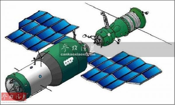 图为苏联“钻石”军用空间站与“联盟”载人飞船对接示意图。
