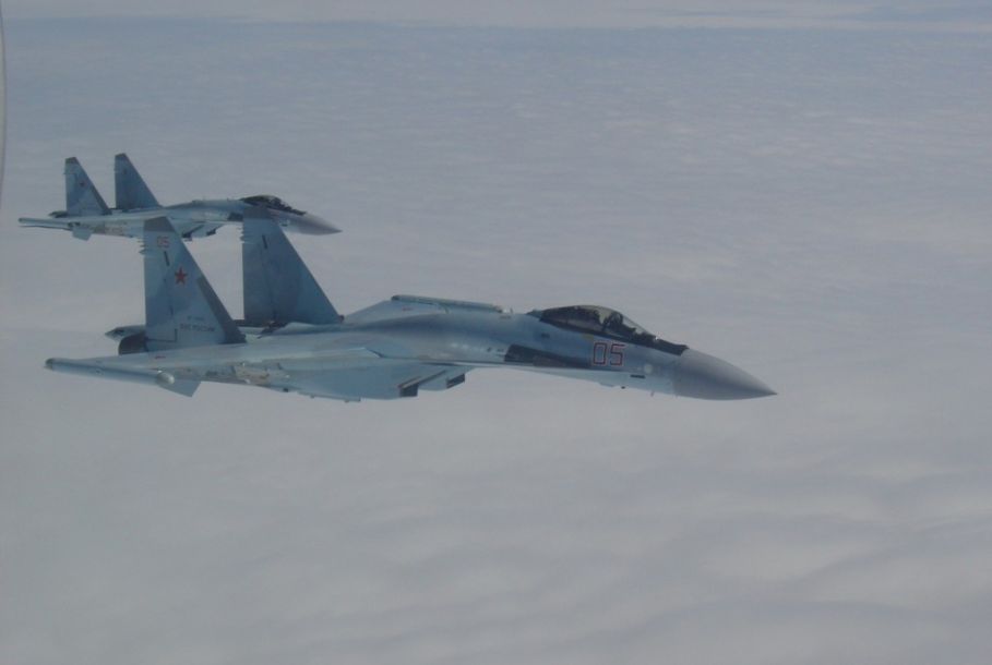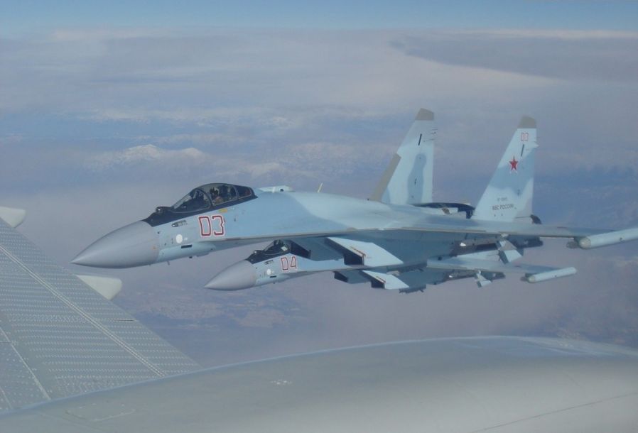 2016年1月30日,俄军四架最新服役的苏-35S重型战斗机飞赴叙利亚参战。这四架战机都是在著名的阿穆尔河畔共青城飞机制造厂制造。鉴于中国购买的苏-35S战机也出自同一制造厂,有西方军事家认为,俄军此次部署的目的或许是向中国客户展示该机型性能。本图由随行的图-154M飞机拍摄。