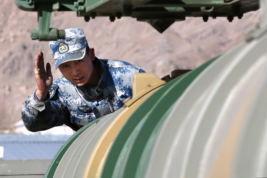2月3日,西部战区空军地空导弹兵某部装填号手快速吊装导弹。