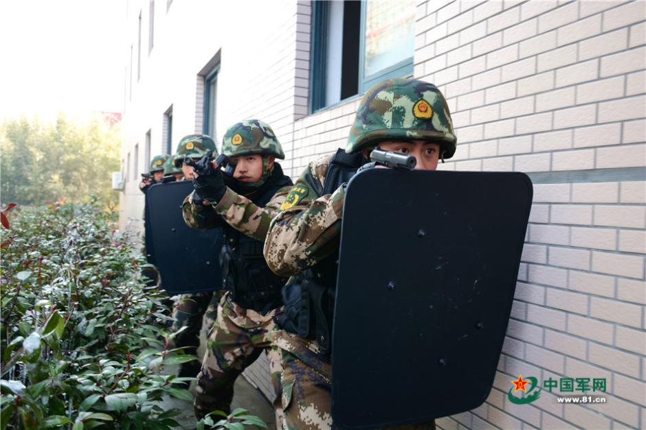 2016年2月3日,武警安徽总队滁州支队组织综合演练,这是特战队员在墙角进行搜索。(刘仕琪 摄影报道 图片来源:中国军网)