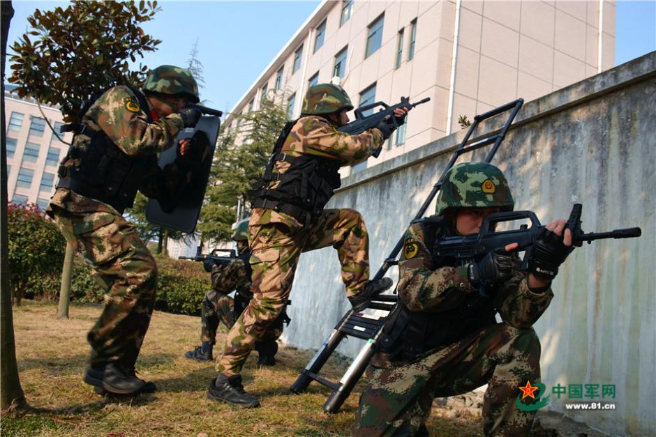 2016年2月3日,武警安徽总队滁州支队组织综合演练,这是特战队员利用折叠梯进行突击。(刘仕琪 摄影报道 图片来源:中国军网)