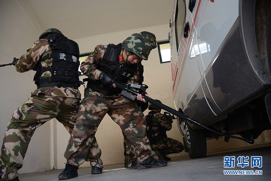 2月3日,武警安徽总队滁州支队组织特战队员开展以反劫持、反爆炸为内容的综合演练,以检验和提高特战官兵应急处突能力。图为特战队员利用车底检查镜对车底进行查验。刘仕琪 摄