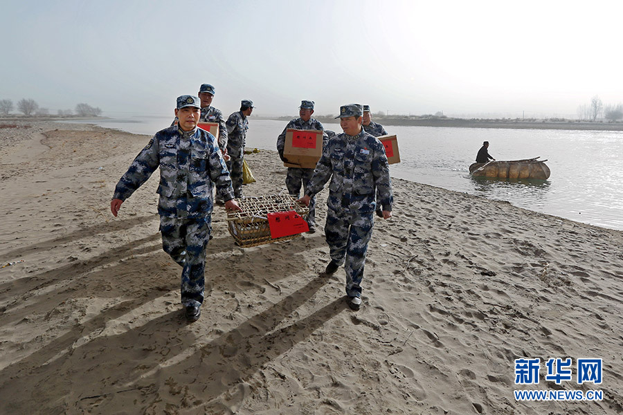 划着筏子登上小岛,空军驻藏某指挥所官兵为守岛战士送来了新年的慰问。刘畅 摄