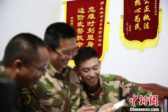 守岛官兵卢烁伟(中)翻阅着手机里女儿的照片,幸福的笑容溢于言表 周捷 摄