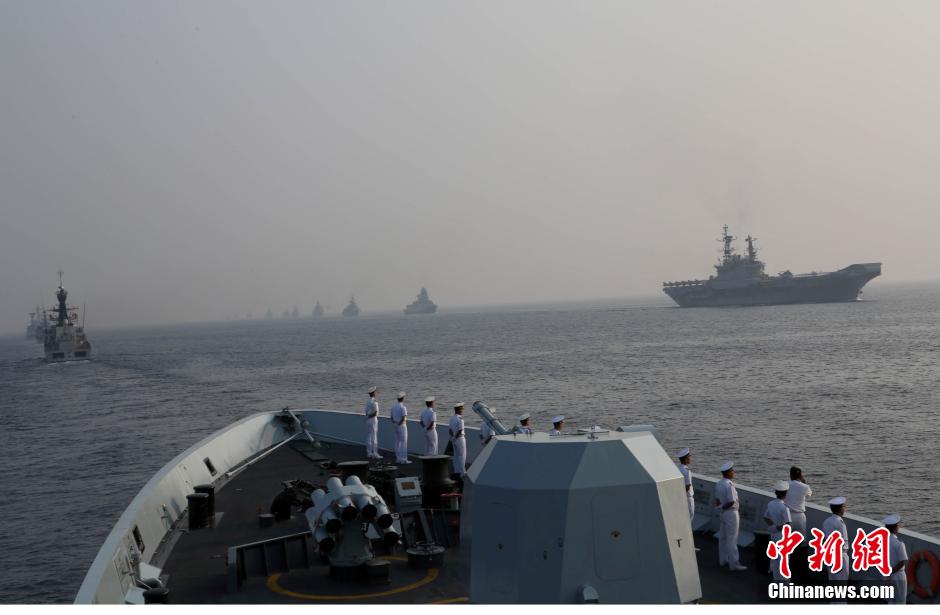 当地时间2月9日,海军第二十一批护航编队柳州舰、三亚舰,代表中国海军圆满完成参阅印度第二届国际海上阅舰式后,在维沙卡帕特南外海与多国海军舰艇举行了联合过航演练。多国海军舰艇举行分航仪式。 中新社发 曾行贱 摄