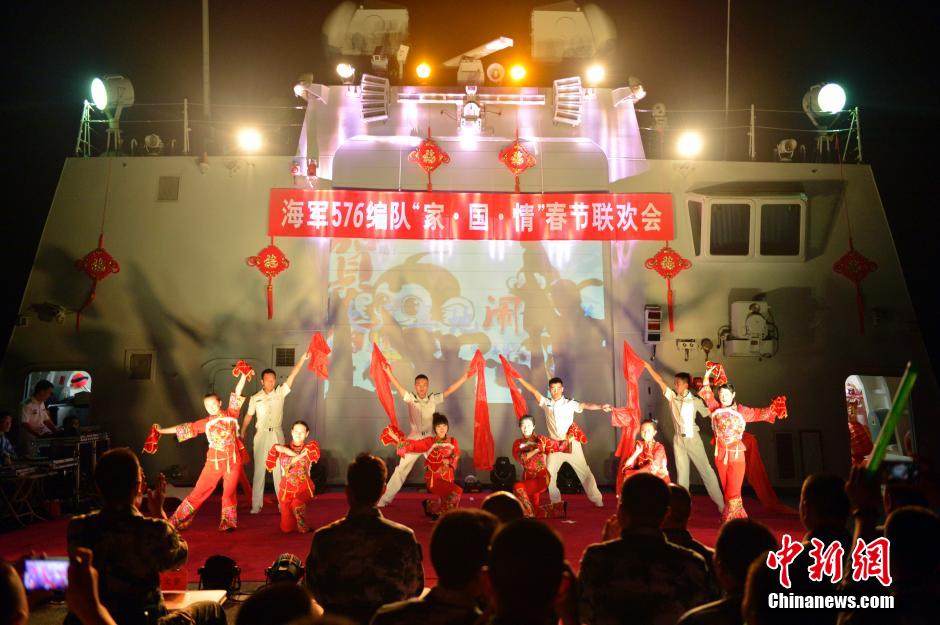 当地时间2月7日晚7时许,正在执行第二十二批护航任务的中国海军舰艇编队大庆舰、青岛舰和太湖舰灯火通明,人头攒动,一场别开生面的甲板“春晚”拉开大幕。大庆舰开场舞蹈《欢天喜地闹大洋》。 中新社发 张海龙 摄