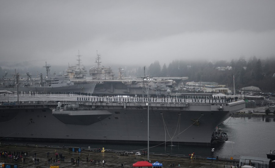 近日,圣迭戈海军基地,威廉·P·劳伦斯(DDG-110)导弹驱逐舰和莫比尔湾(CG-53)号导弹巡洋舰,将与1月15日离开吉塞普海军基地的钟云号导弹驱逐舰一起加入斯坦尼斯号核动力航母(CVN-74)航母打击群进行为期7个月的作战部署。这也是美军“大绿舰队”的首次作战部署。所有的军舰和舰载机都将使用绿色环保的核能和生物燃料。