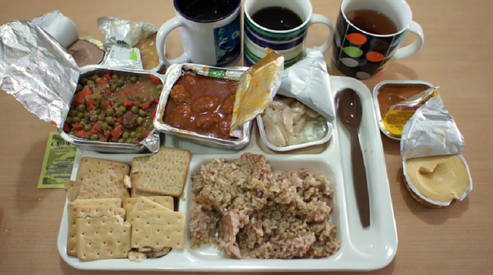 俄罗斯俄军士兵的干粮好吃又简单。这份午餐是俄罗斯军队士气高的秘密。您会在套餐中看到:豌豆肉罐头、午餐肉、鱼罐头、6个小面包、带2包糖的速溶茶叶、干燥天然浓缩饮料、口香糖、1包速溶咖啡、4包砂糖、果泥、番茄酱、融化干酪、蔬菜鱼子酱、1片复合维生素、3片水消毒药片、便携式加热器、罐头刀、抗风抗水火柴、3片消毒纸巾。吃完这套午餐,士兵是不会饿肚子的。