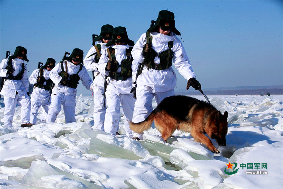 边防战士黑超遮面雪地巡逻 如同在月球漫步