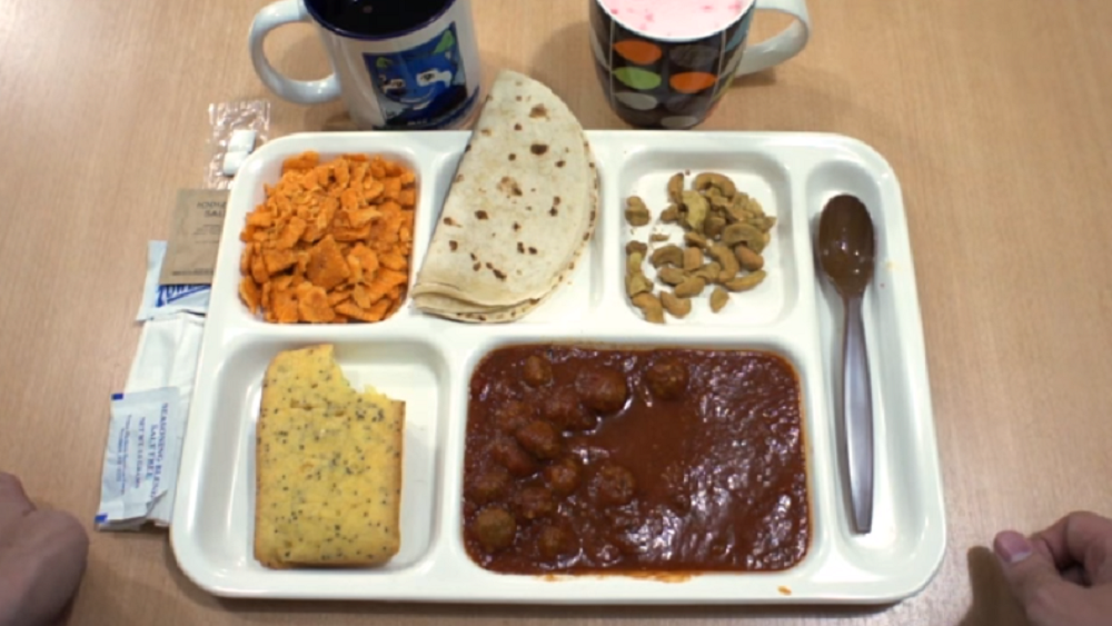 美国带蔬菜和主食的焖肉、花生、带罂粟籽的柠檬蛋糕、口香糖、蔗糖、盐、速溶咖啡、茶、可可、奶粉、水果速溶饮料、许多咸饼干、湿纸巾或干燥餐巾纸。战地午饭时用的是配套的无明火加热器。