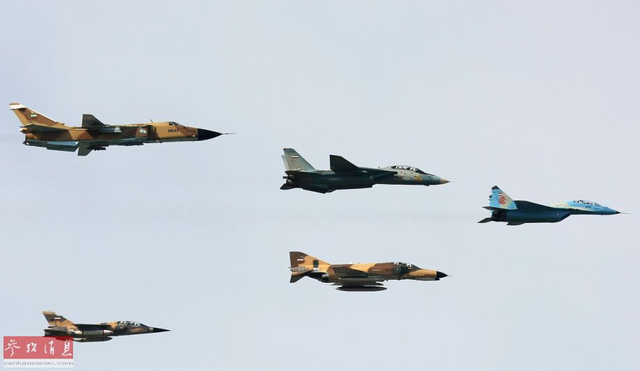 参演的伊朗空军战机编队,包括了俄制米格-29、美制F-4、F-14和法制幻影F1C战斗机以及俄制苏-24战斗轰炸机。