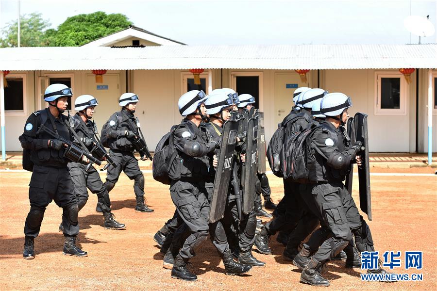 在利比里亚格林维尔,中国维和警察防暴队队员进行防暴队形演练(2015年11月4日摄)。新华社记者孙瑞博摄
