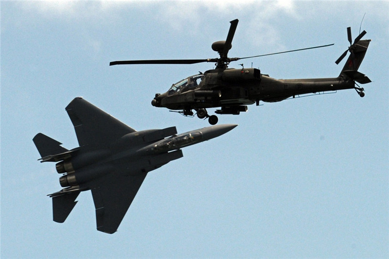 2月16日,新加坡空军F-15SG战斗机(左)与AH-64D阿帕奇直升机在新加坡航空展上进行特技飞行表演。邓智炜摄