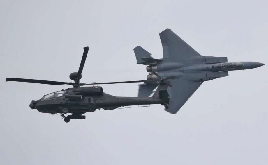 新加坡空军AH-64D”长弓阿帕奇“与F-15SG战斗轰炸机进行惊险对冲表演彩排。