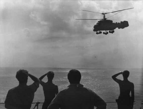 另一艘苏联“克莱斯塔”级驱逐舰派出直升机观察“皇家方舟”号航母。