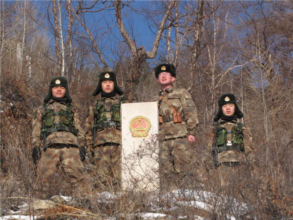暴风雪中,沿界河巡逻的官兵整齐列阵,向着高高耸起的峭壁齐声大喊——