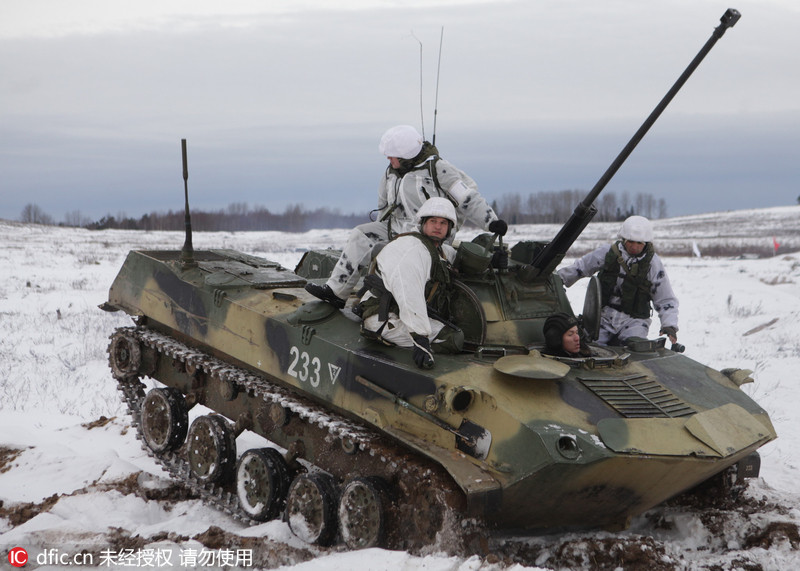 当地时间2016年2月19日,俄罗斯普斯科夫州,俄空降部队在该区域举行大规模军事演习。(Sergei Konkov/东方IC)