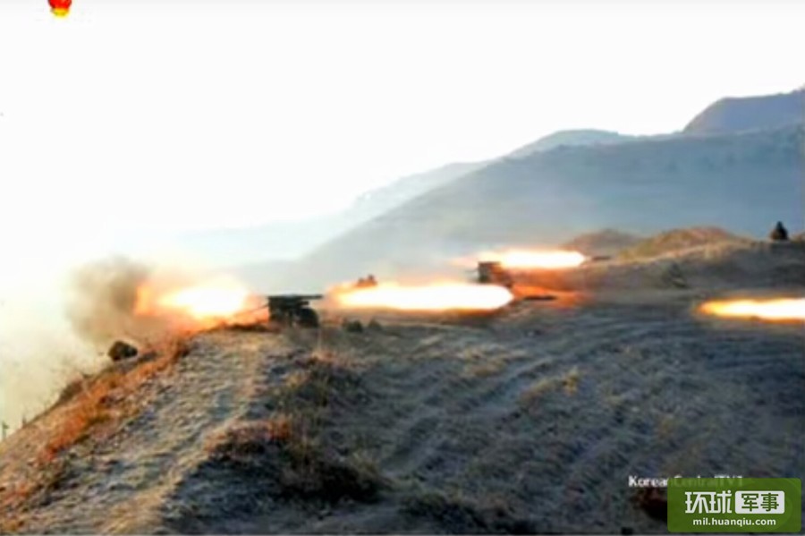 朝军大演习山顶上火箭炮横飞