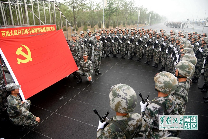 图为抗战胜利大阅兵开始前,该集团军百团大战“白刃格斗英雄连”党支部组织官兵重温入党誓词。(彭田摄)