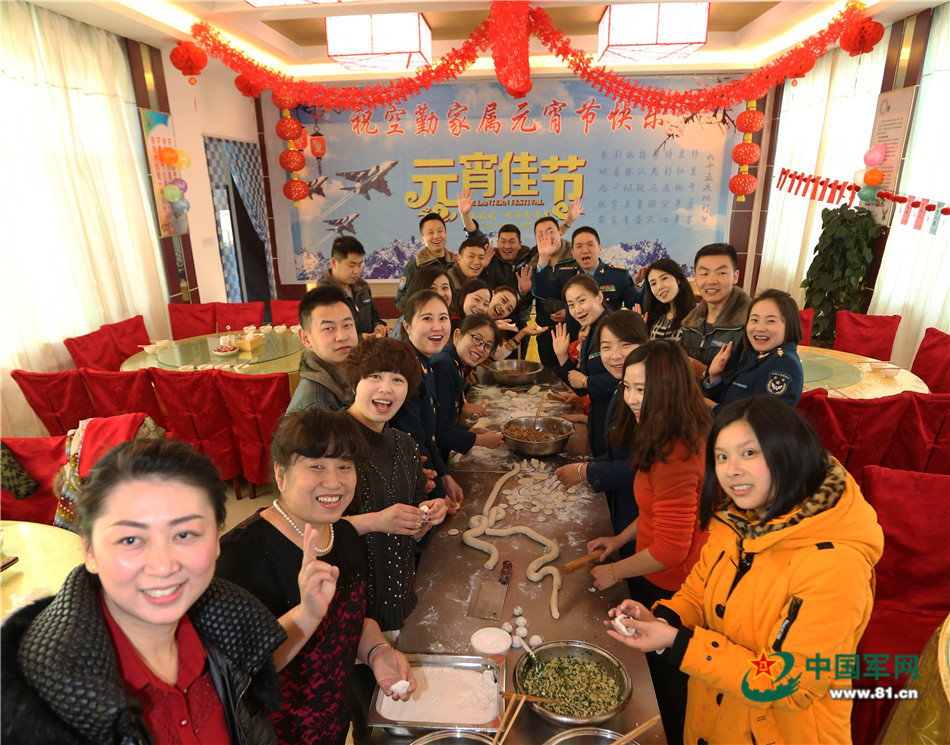 傍晚,军营被皑皑白雪覆盖,屋外天寒地冻。记者来到旅空勤灶,呈现在眼前的却是热气腾腾、暖意融融的喜乐景象:包饺子,填满祝愿;吃元宵,咬住甜蜜;猜灯谜,弥漫开心;话团圆,祈福平安。旅长沈元中带领在家飞行员和空勤家属一同搓元宵、包饺子,将元宵节团圆系列活动推向高潮。