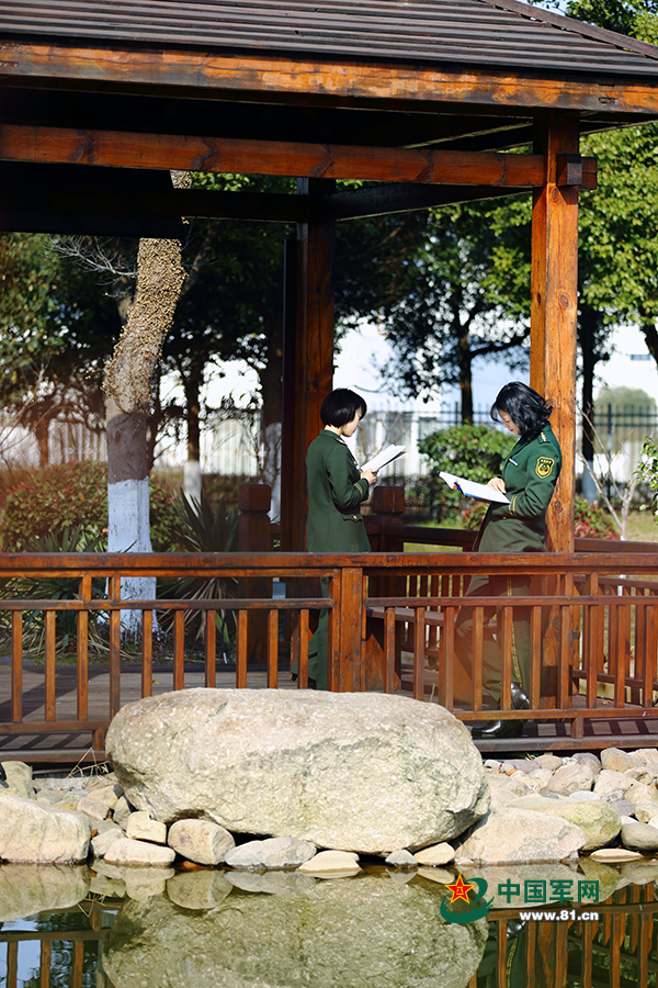 工作之外的蔡丽红,是一个文艺范十足的女孩。由于家人都在南通老家,自己一个人在无锡工作,她每到休息日基本上都和闺蜜一起外出逛街、读书、拍照、购物、看电影,生活非常充实。图为蔡丽红(右)和同事高洁一起在营区的亭子内看书。王宇 摄
