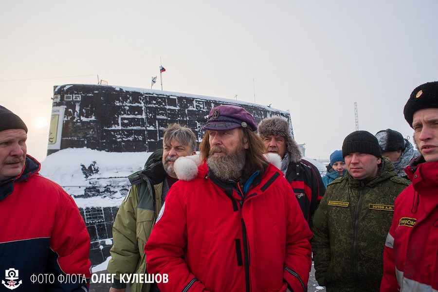 2月23日,北德文斯克,俄罗斯海军北方舰队邀请北极探险队参观“台风”级核潜艇。探险队2月10日从卡累利阿共和国出发,采用狗拉雪橇方式到达这里。