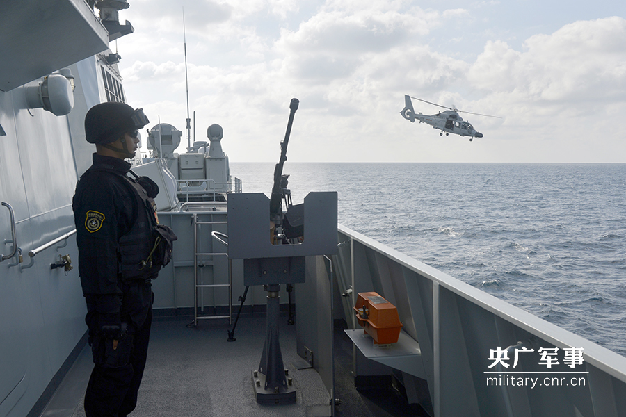 联合反海盗部署中,大庆舰舰载直升机前出警戒。张海龙摄