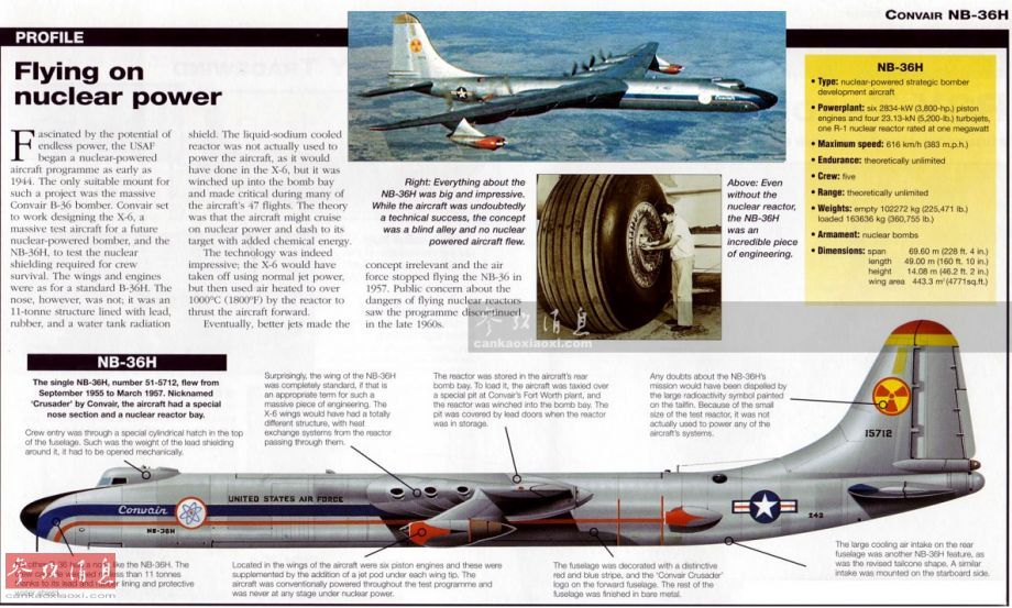 当时“甲虫”主要是为NB-36H“十字军”核动力轰炸机试验机提供地勤维护。这架试验机由B-36轰炸机改进而来,搭载了一座1000千瓦的气冷式核反应堆(但并不为飞机提供动力),动力系统采用独特的活塞+喷气混合动力(6台活塞式螺旋桨发动机+4台喷气发动机)。小图为试飞中的NB-36H。