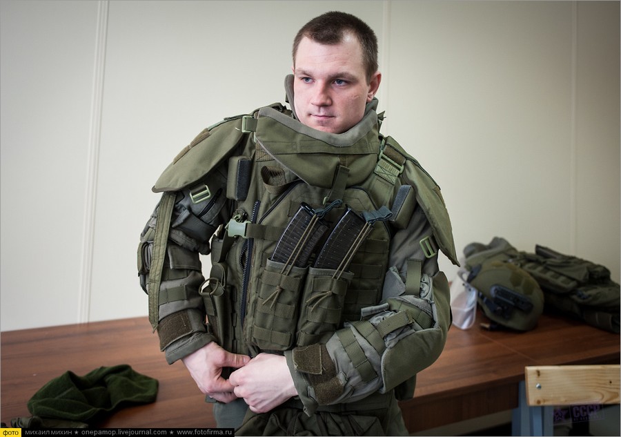 正在穿防弹衣的战斗工兵,注意这位弹匣袋里装的是RPK-74M机枪上用的45发长弹匣。