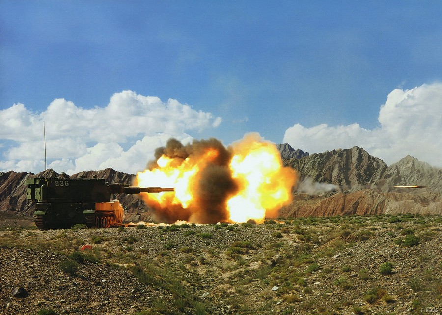 近日,网友整理了一组中国陆军所装备的PLZ-05式155毫米自行榴弹炮的高清美图。图为PLZ-05式自行榴弹炮进行平射训练。
