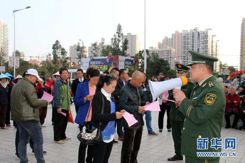 3月2日,广西北海边防支队电建边防派出所在辖区召开2月份警情通报现场会,民警现场模拟“盗抢骗”,提高群众安全意识。