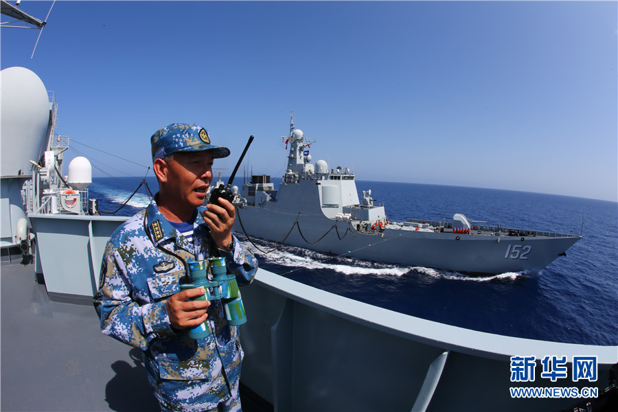 东海舰队“首届强军先锋”、某作战支援舰副支队长潘志强在补给现场指挥 代宗锋摄
