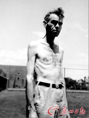 资料图:在实验期间,有3个志愿者由于无法忍受而选择中途退出,余下的人大都减掉了25%的体重。图为被饿得骨瘦如柴的一名志愿者。
