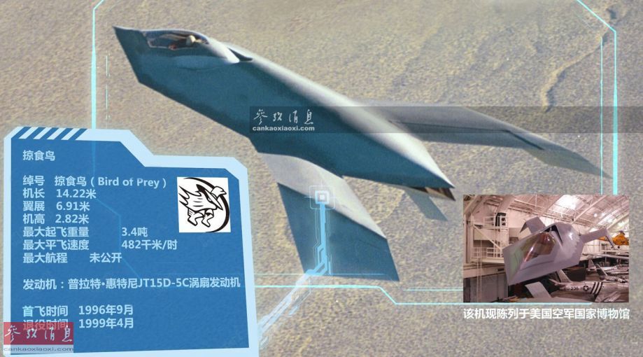 掠食鸟”隐身技术验证机由波音公司旗下的“鬼怪工厂”研发,属于美国国防部“黑色计划”绝密研发项目,项目总耗资6700万美元。在该机上验证的隐身技术后来应用于X-32系列隐身战机(波音的JSF竞标机型,后败于洛马的X-35)和X-45系列无人战机。