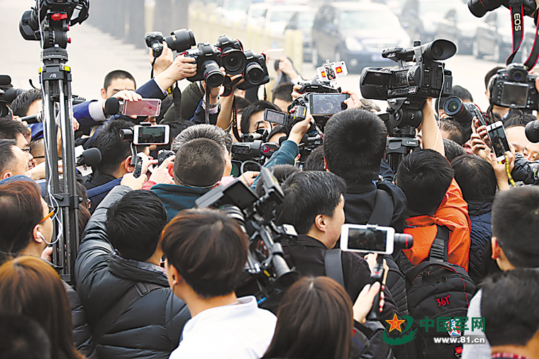 3月3日下午,全国政协十二届四次会议在北京人民大会堂隆重开幕。图为在人民大会堂前记者对政协委员进行采访。本报记者 穆可双摄