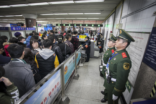 晚高峰时段的地铁国贸站,人流如织。七支队十九中队官兵正在认真履行职责。 刘长鑫 摄